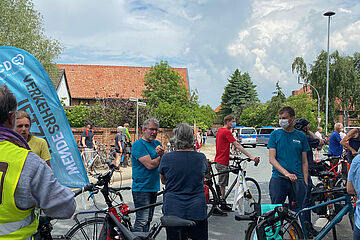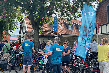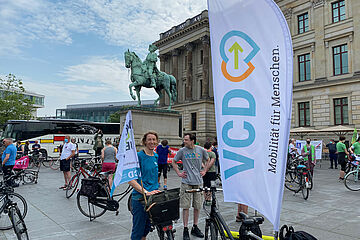 Mit über 500 fahrradfahrenden Menschen zeigte auch der VCD tatkräftig Flagge. Wir nutzten mehrere Beachflags, die von Weitem sichtbar waren. Harald Walsberg konnte als Vertreter des Landesverbandes mit seiner flammenden und informativen Rede zu Beginn und auch beim Zwischenstopp in Scheppau die Zuhörer*innen gut einstimmen.