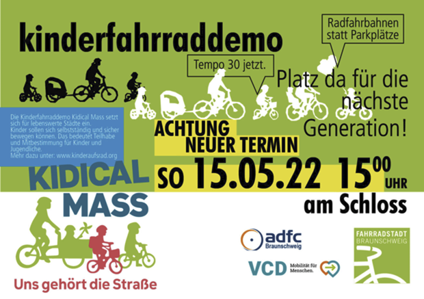 Beginnend mit Begrüßung und T-Shirt-Verlosung auf dem Schlossplatz wird eine schöne Runde ums Theater gefahren, dann über Georg-Eckert-Straße und Kennedyplatz entlang des Kalenwalls, bis hin zum Radeklint im Westen, um schließlich am Kohlmarkt eine Abschlusskundgebung abzuhalten. Insgesamt wird mit einer Dauer von ca. 2 Stunden gerechnet. Die 5 km lange Route wird wie schon in den Vorjahren in gemächlichem, kindgerechtem Tempo mit begleitender Polizeieskorte gefahren – frei auf der Straße, ein besonderes Erlebnis für Kinder und erwachsene Begleitpersonen. Bei der „Kidical Mass“ handelt es sich um bundesweite Kinderfahrraddemos in 180 Städten und Gemeinden, angelehnt an die in vielen Städten monatlich stattfindende „Critical Mass“. In Braunschweig wird die Aktion organisiert von der Initiative Fahrradstadt Braunschweig, unterstützt wird sie auch von den Verbänden ADFC Braunschweig und VCD Braunschweig. Beim Ausbau des Radverkehrs besteht großer Handlungsbedarf zur Schaffung von kindersicheren Kreuzungen und Querungen. Radwege, die vor jeder Kreuzung wieder enden und als Markierungslösung unmittelbar an den Kfz-Verkehr herangeführt werden, seien nicht geeignet, Kindern eigenständige Mobilität zu ermöglichen. Erforderlich sei die Weiterentwicklung geschützter und stressarmer Kreuzungsdesigns, wie es sie seit Jahrzehnten in den Niederlanden, aber auch an wenigen Stellen in Braunschweig gibt. Es brauche Radwege und Kreuzungen, die allen Altersgruppen Lust aufs Radfahren machen und die fehlerverzeihend gestaltet sind. Der Termin war verschoben worden, nach dem die Polizei im Kooperationsgespräch große Sorgen um ihre Kapazitäten thematisiert hatte. Als Grund wurde der zu erwartende große Zulauf an Anhängern von Eintracht Braunschweig rund um den Aufstieg in der Innenstadt genannt. |