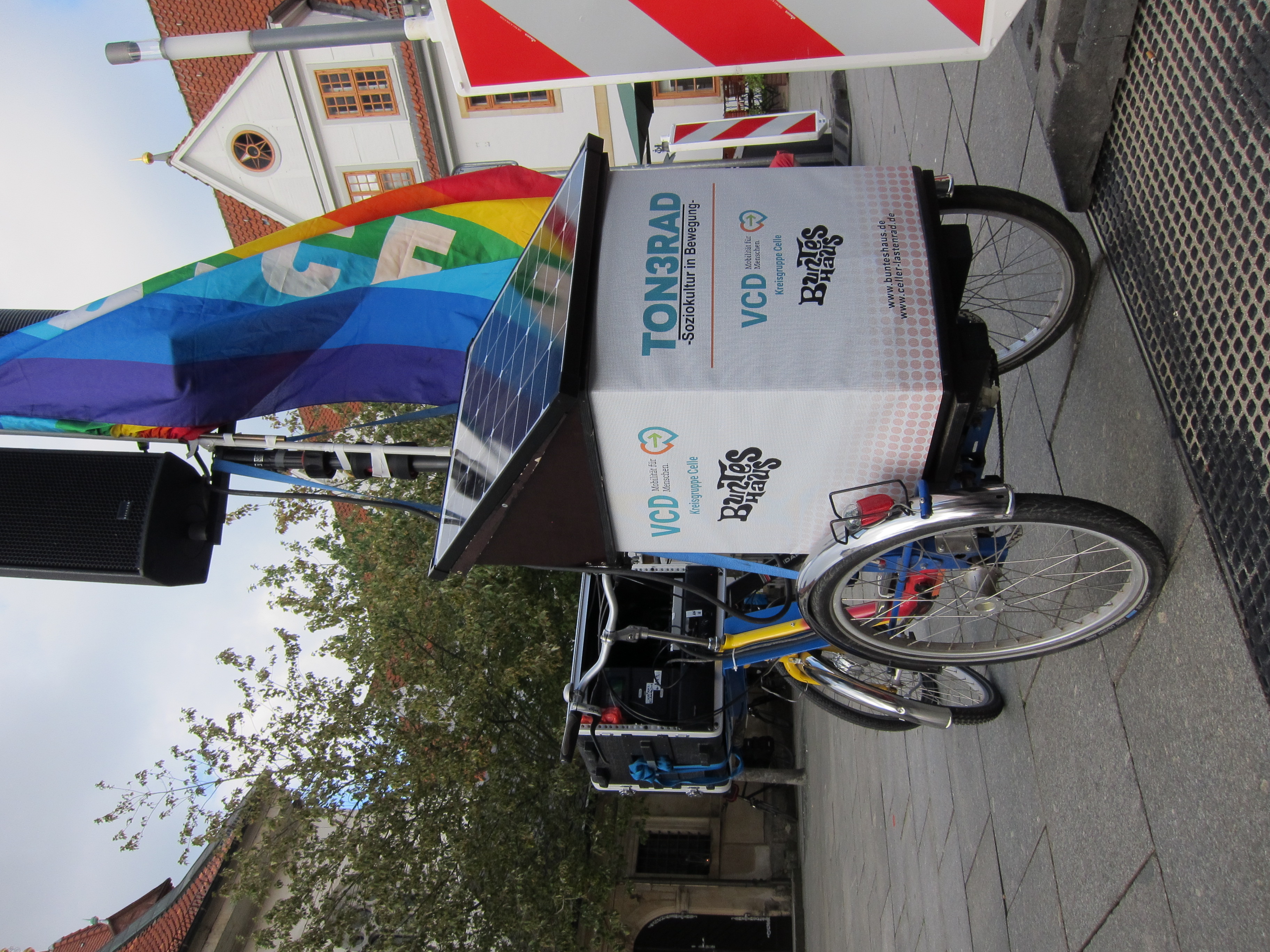 Wir sind sehr stolz und freuen uns, dass jetzt das Ton3Rad fertig ist. Zuletzt wurde die PVC-freie Beschriftungsfolie angebracht. Die ersten Einsätze (wie zuletzt am Antikriegstag) wurden mit Bravour und perfekter Tonqualität gemeistert. Wer das Ton3Rad live erleben möchte, ist herzlich zu unseren nächsten Veranstaltungen eingeladen. Beispielsweise am nächsten Samstag bei der Kidical Mass wird die Rede über die Verstärkeranlage und den Lautsprecher des Ton3Rads zu hören sein. Und dann fährt das Tonr3Rad natürlich mit auf der Demo und es gibt Fahrrad-Lieder zu hören.