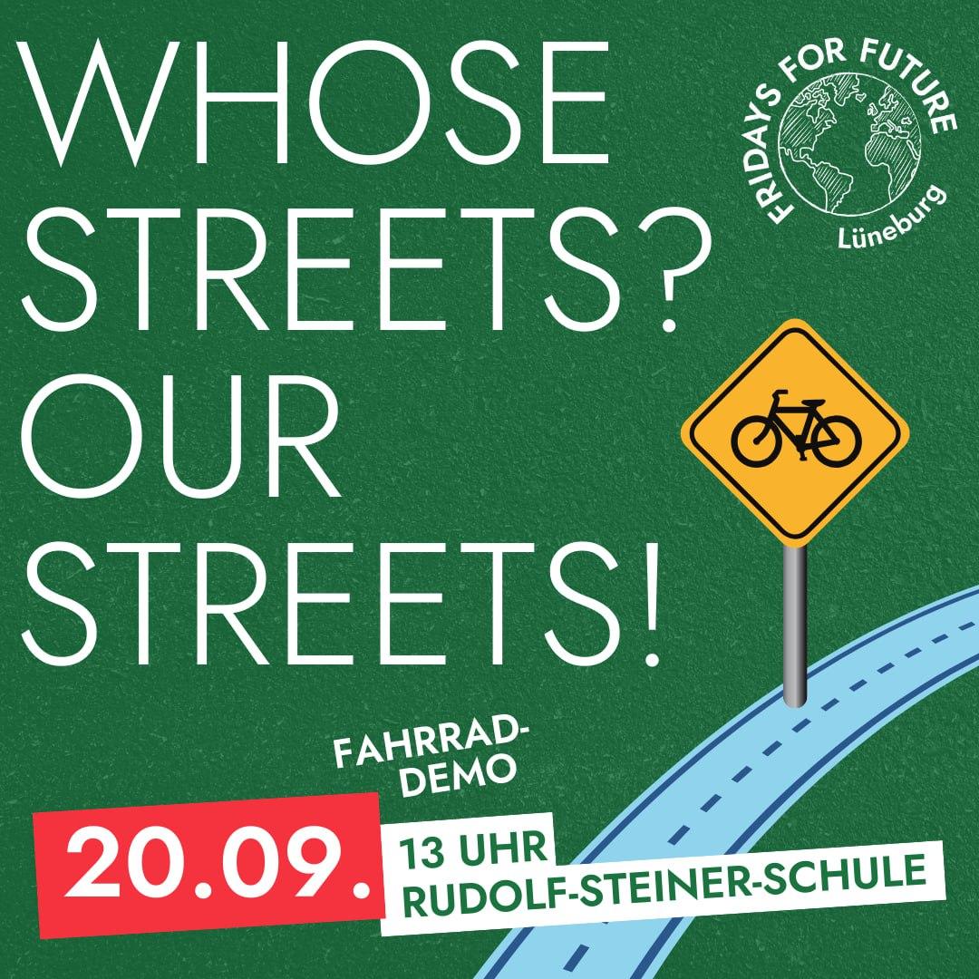 Außerdem ist an dem Tag auch Klimastreik. Dieses Jahr mit einer Fahrraddemo unter dem Motto "Whose Streets? Our streets!". Die Fahrraddemo startet um 13 Uhr an der Rudolf-Steiner-Schule und endet beim Parking Day in der Bardowicker Straße. Auf dem Weg wird an verschiedenen Schulen vorbei gefahren.