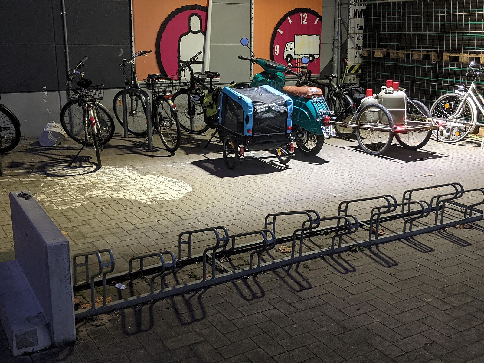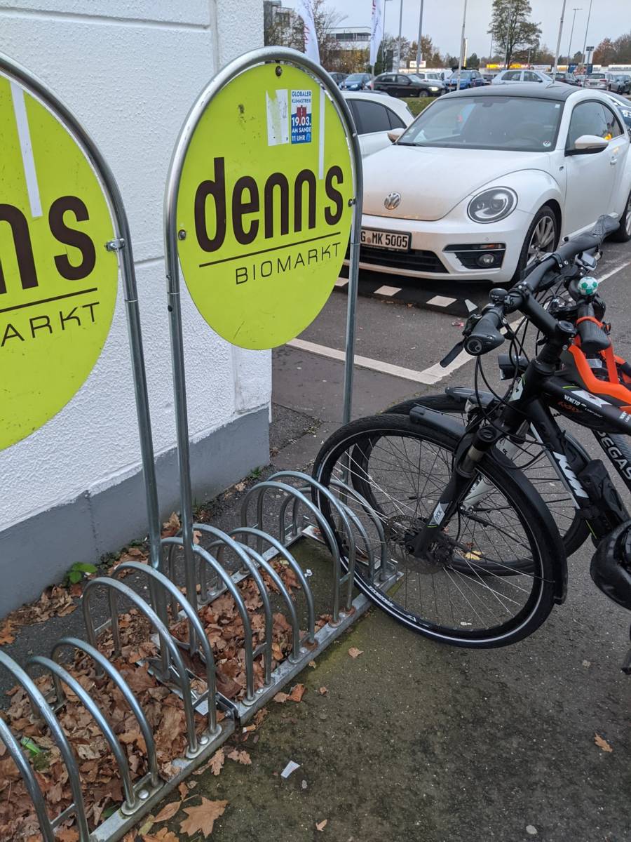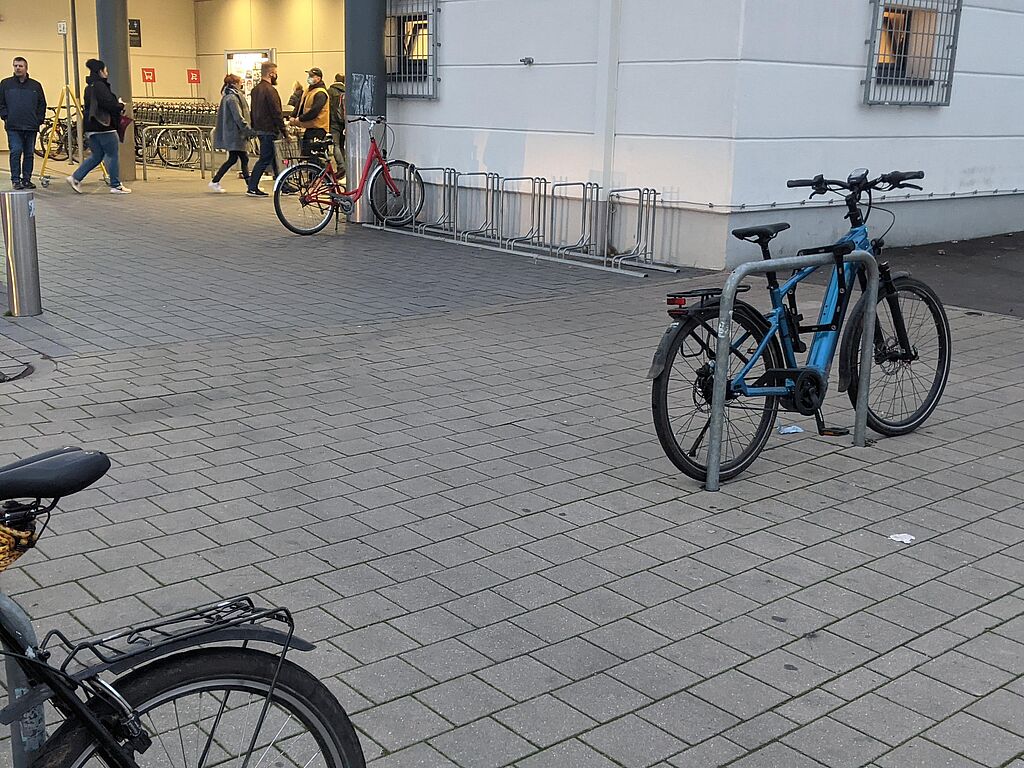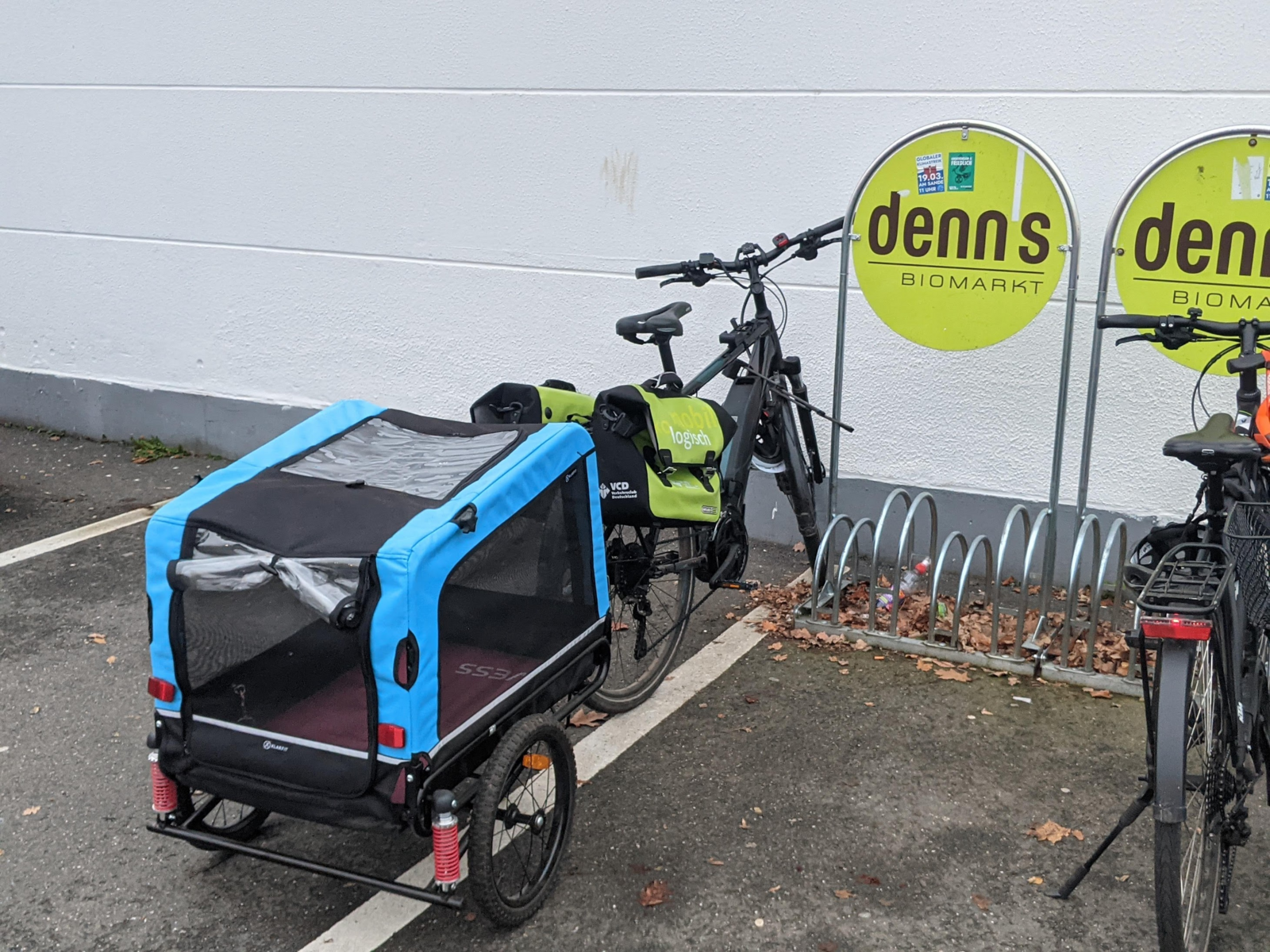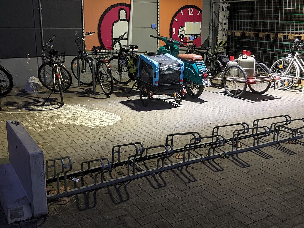 Nach Verlassen des Ladens wurde hier noch ein weiteres Rad mit Anhänger und ein "normales" Fahrrad geparkt. Keines war wie vorgesehen an den Bügeln angeschlossen.