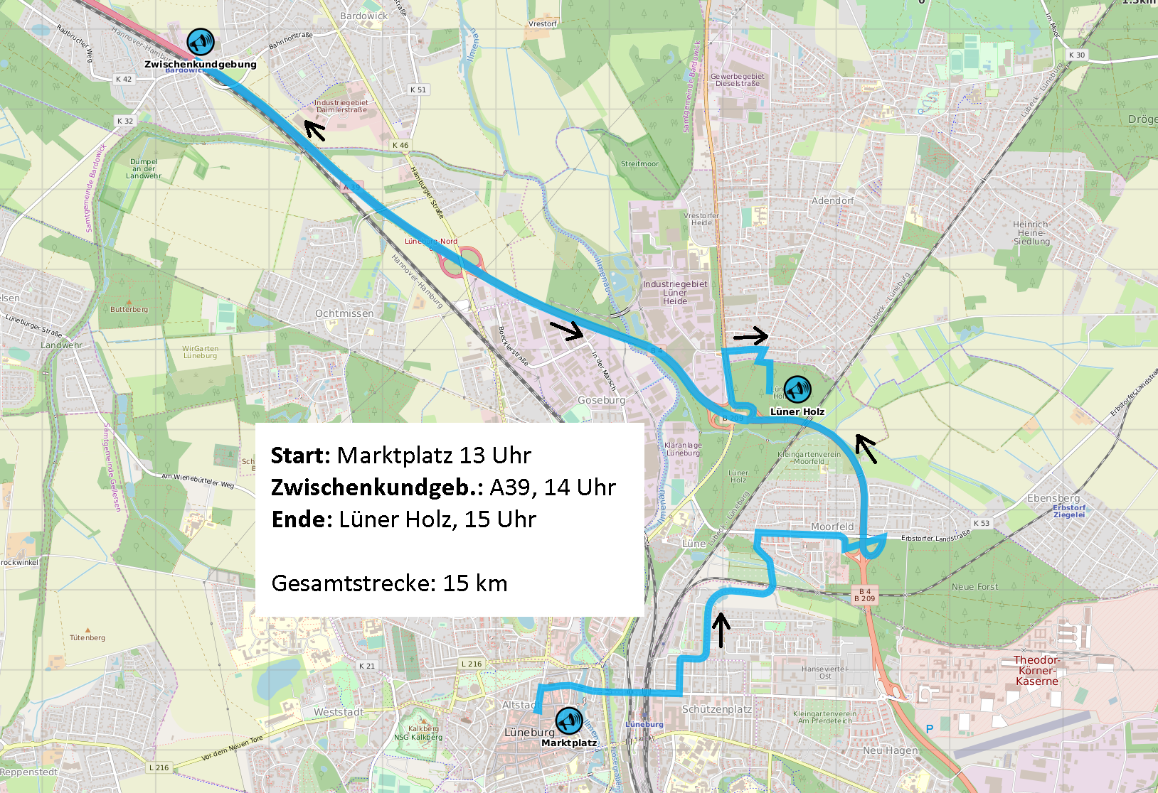 Route: Marktplatz, Lüner Straße, Bleckeder Straße, Meisterweg, Erbsdorfer Landstraße, Ostumgehung Richtung Norden, A39 bis Höhe Bardowick - Zwischenstopp - zurück auf A39 und Ostumgehung Richtung Süden bis Ausfahrt Adendorf, Artlenburger Landstraße, Grüner Weg, Lüner Holz, Abschlusskundgebung