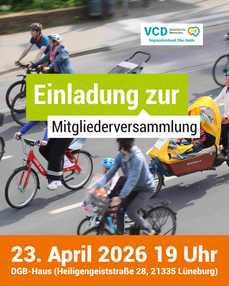 Der Vorstand lädt alle Mitglieder, Interessierte und Freund:innen des VCD Regionalverbandes Elbe-Heide herzlich zur diesjährigen Mitgliederversammlung nach Lüneburg ein.