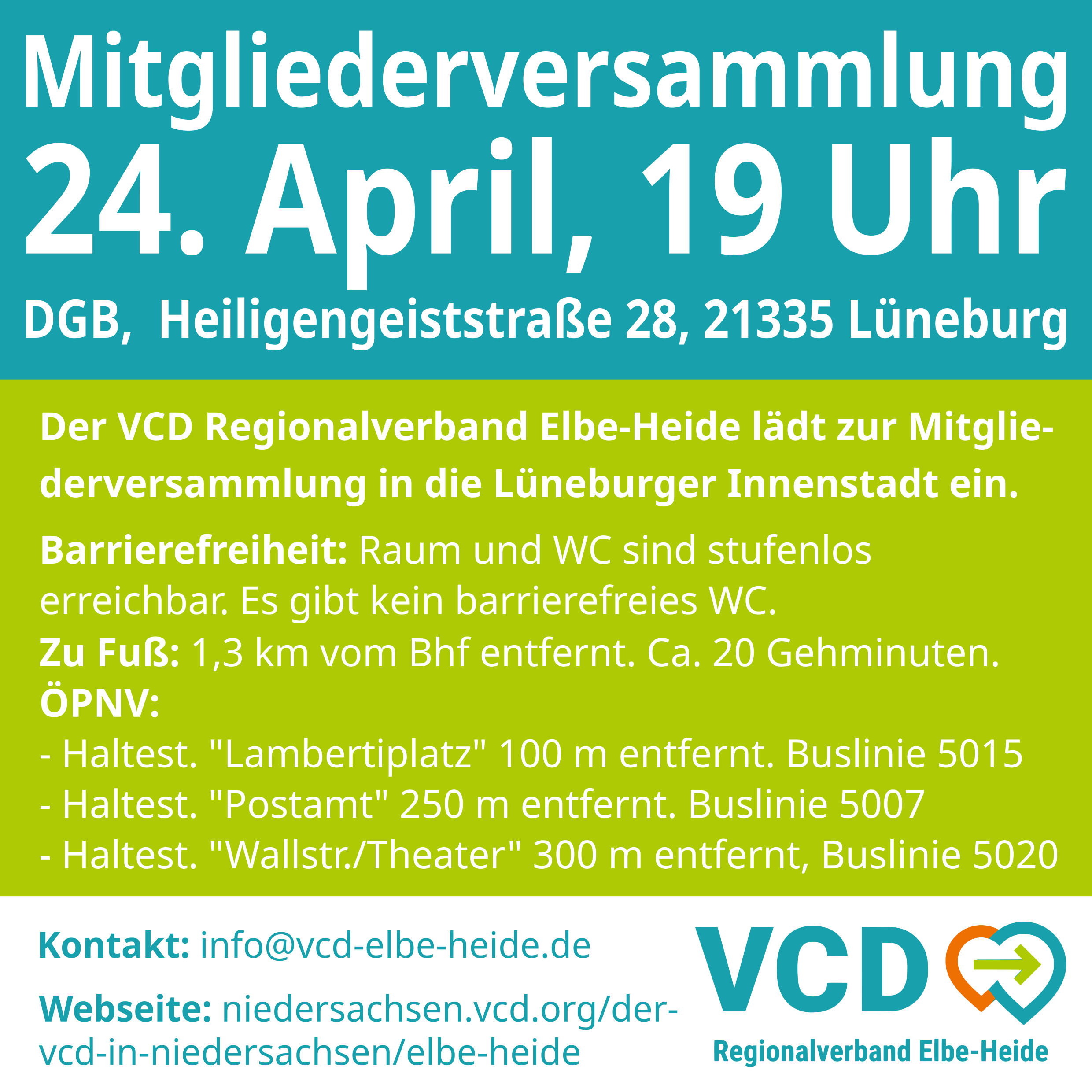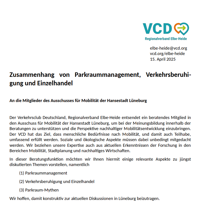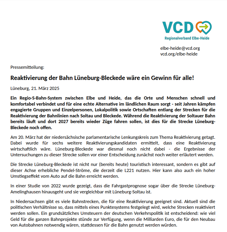 Der Vorstand lädt alle Mitglieder und sonstige Interessierte des VCD Regionalverbandes Elbe-Heide herzlich zur diesjährigen Mitgliederversammlung am 24. April 2025 in die Lüneburger Innenstadt ein. mehr