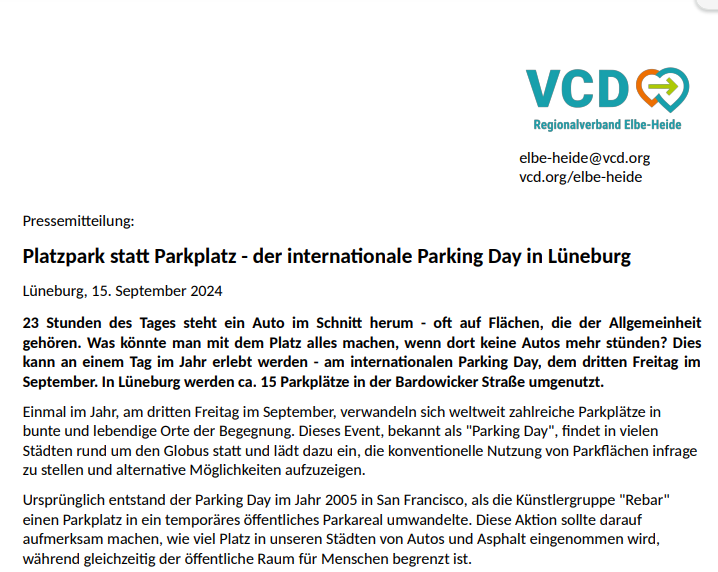 23 Stunden des Tages steht ein Auto im Schnitt herum - oft auf Flächen, die der Allgemeinheit gehören. Was könnte man mit dem Platz alles machen, wenn dort keine Autos mehr stünden? Dies kann an einem Tag im Jahr erlebt werden - am internationalen Parking Day, dem dritten Freitag im September. In Lüneburg werden ca. 15 Parkplätze in der Bardowicker Straße umgenutzt mehr