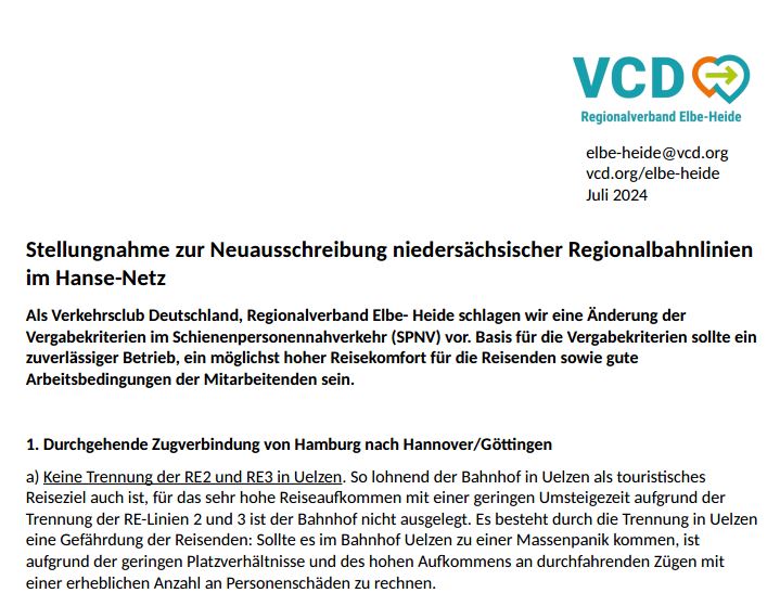 Als Verkehrsclub Deutschland, Regionalverband Elbe- Heide schlagen wir eine Änderung der Vergabekriterien im Schienenpersonennahverkehr (SPNV) vor. Basis für die Vergabekriterien sollte ein zuverlässiger Betrieb, ein möglichst hoher Reisekomfort für die Reisenden sowie gute Arbeitsbedingungen der Mitarbeitenden sein. mehr