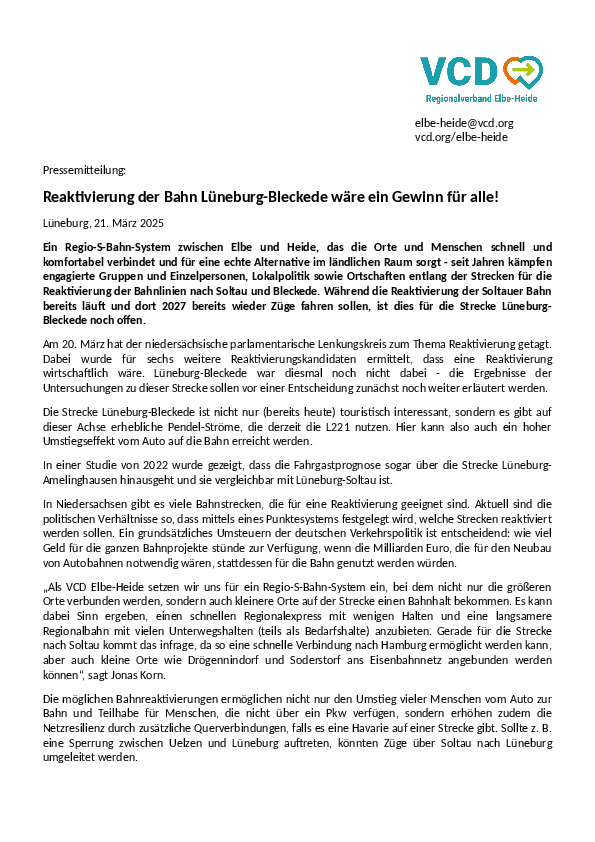 „Als VCD Elbe-Heide setzen wir uns für ein Regio-S-Bahn-System ein, bei dem nicht nur die größeren Orte verbunden werden, sondern auch kleinere Orte auf der Strecke einen Bahnhalt bekommen. Es kann dabei Sinn ergeben, einen schnellen Regionalexpress mit wenigen Halten und eine langsamere Regionalbahn mit vielen Unterwegshalten (teils als Bedarfshalte) anzubieten. Gerade für die Strecke nach Soltau kommt das infrage, da so eine schnelle Verbindung nach Hamburg ermöglicht werden kann, aber auch kleine Orte wie Drögennindorf und Soderstorf ans Eisenbahnnetz angebunden werden können“, sagt Jonas Korn.