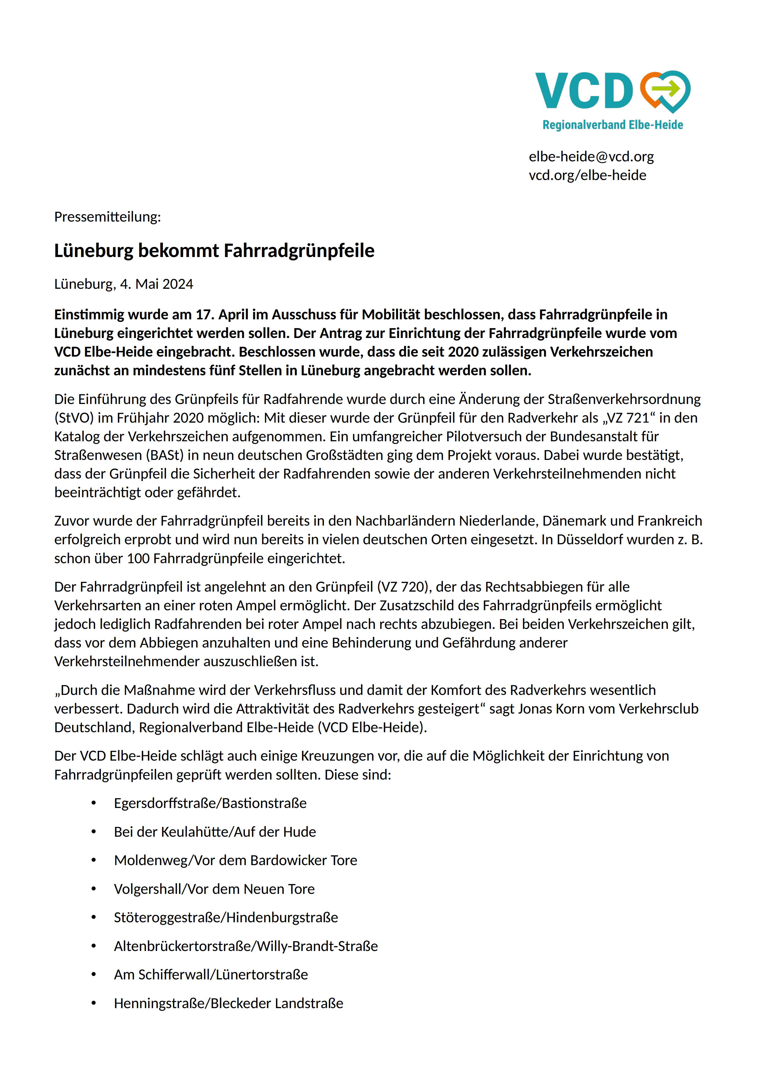 Lüneburg eingerichtet werden sollen. Der Antrag zur Einrichtung der Fahrradgrünpfeile wurde vom VCD Elbe-Heide eingebracht. Beschlossen wurde, dass die seit 2020 zulässigen Verkehrszeichen