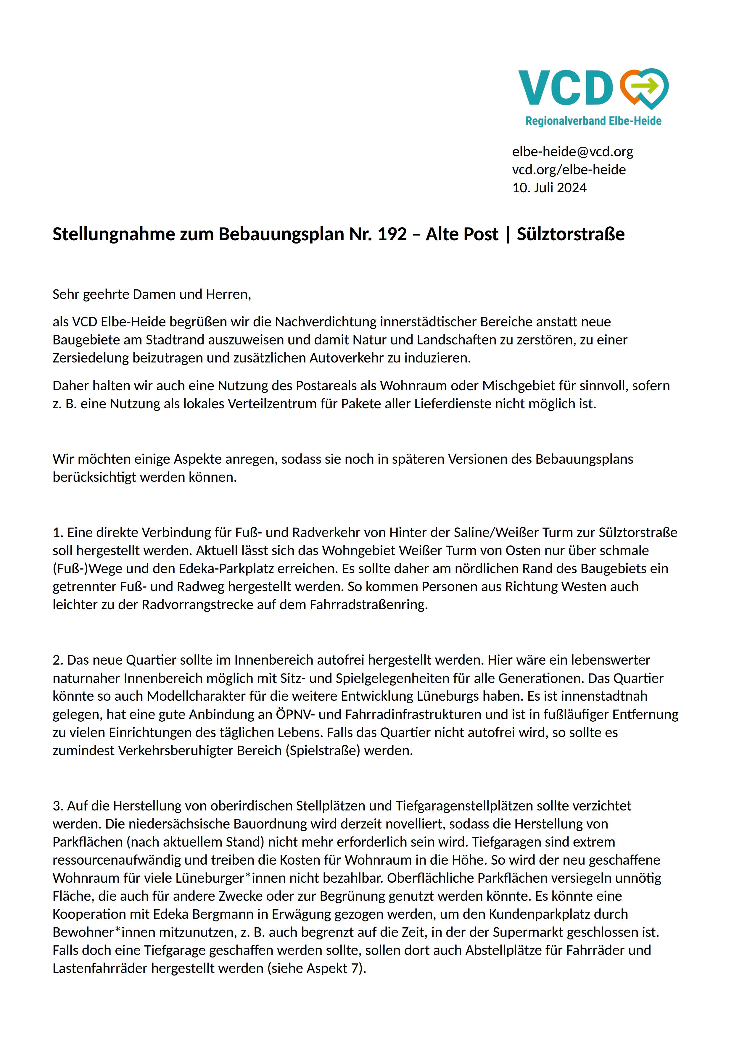als VCD Elbe-Heide begrüßen wir die Nachverdichtung innerstädtischer Bereiche anstatt neue Baugebiete am Stadtrand auszuweisen und damit Natur und Landschaften zu zerstören, zu einer Zersiedelung beizutragen und zusätzlichen Autoverkehr zu induzieren.
