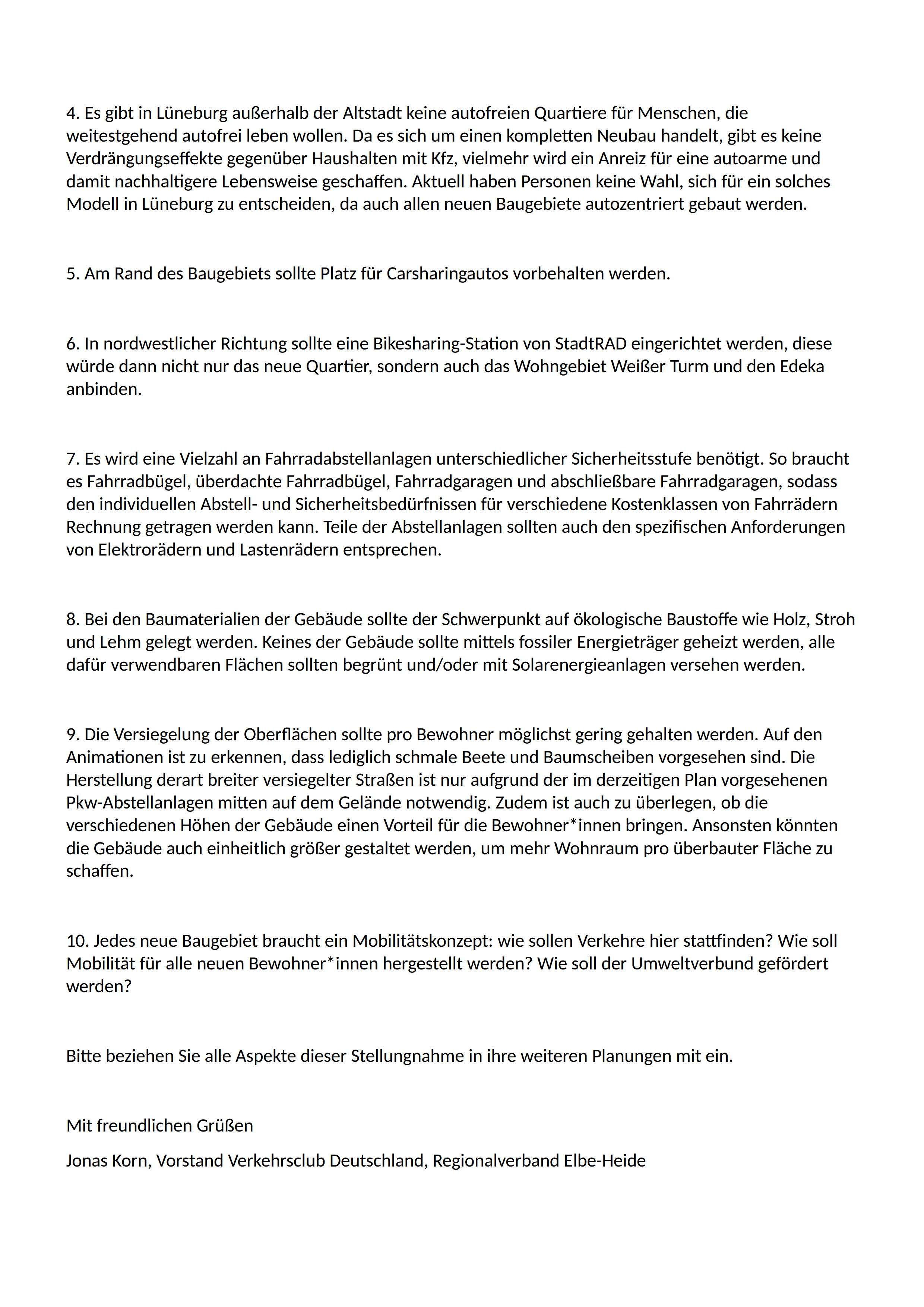 4. Es gibt in Lüneburg außerhalb der Altstadt keine autofreien Quartiere für Menschen, die weitestgehend autofrei leben wollen. Da es sich um einen kompletten Neubau handelt, gibt es keine Verdrängungseffekte gegenüber Haushalten mit Kfz, vielmehr wird ein Anreiz für eine autoarme und damit nachhaltigere Lebensweise geschaffen. Aktuell haben Personen keine Wahl, sich für ein solches Modell in Lüneburg zu entscheiden, da auch allen neuen Baugebiete autozentriert gebaut werden.