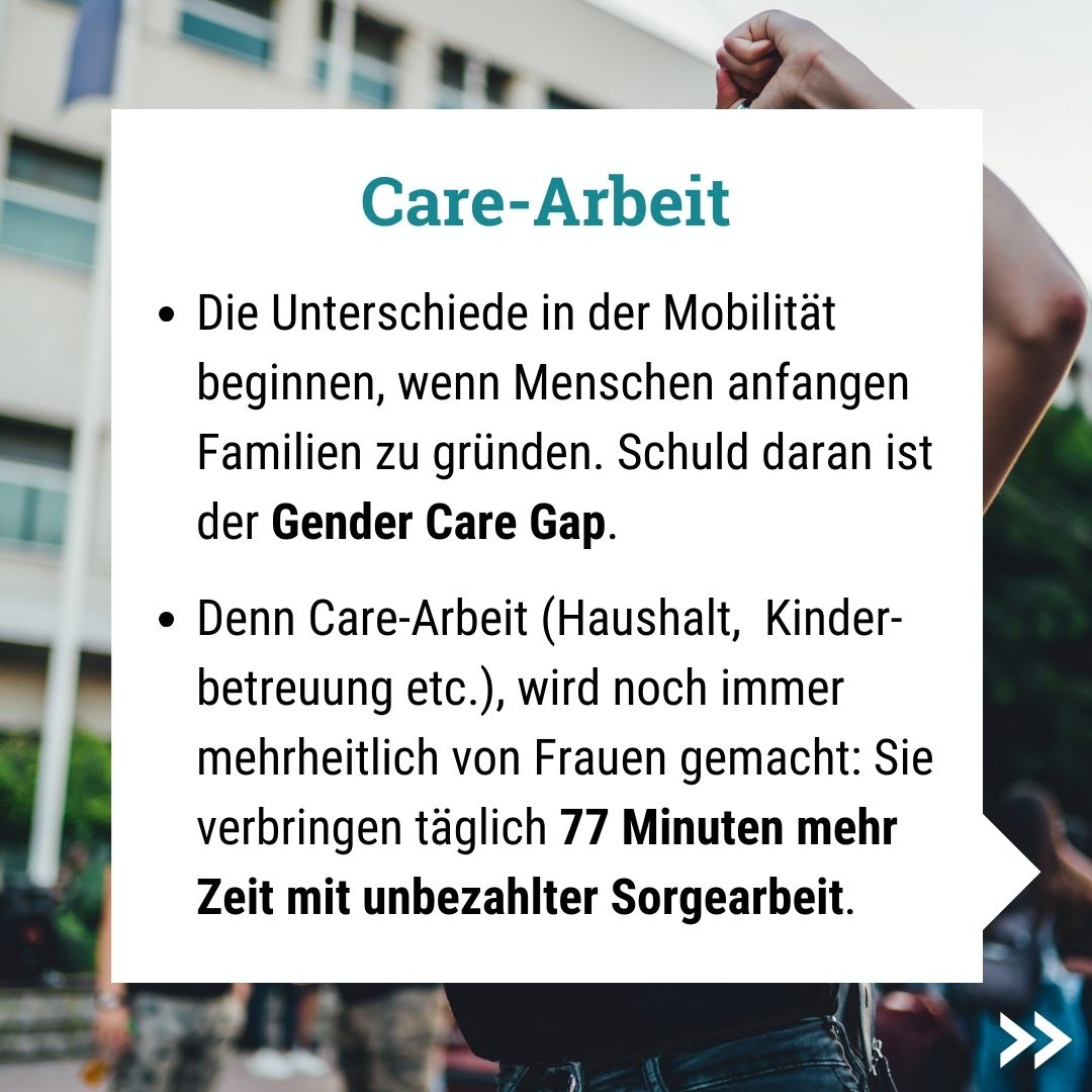Die Unterschiede in der Mobilität beginnen, wenn Menschen anfangen Familien zu gründen. Schuld daran ist der Gender Care Gap. Denn Care-Arbeit (Haushalt, Kinderbetreuung etc.), wird noch immer mehrheitlich von Frauen gemacht.