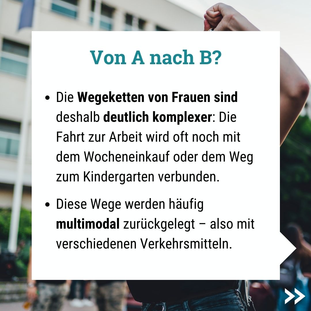 Die Wegeketten von Frauen sind deshalb deutlich komplexer: Die Fahrt zur Arbeit wird oft noch mit dem Wocheneinkauf oder dem Weg zum Kindergarten verbunden.