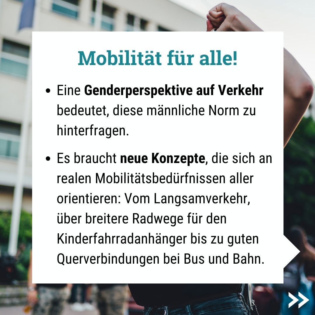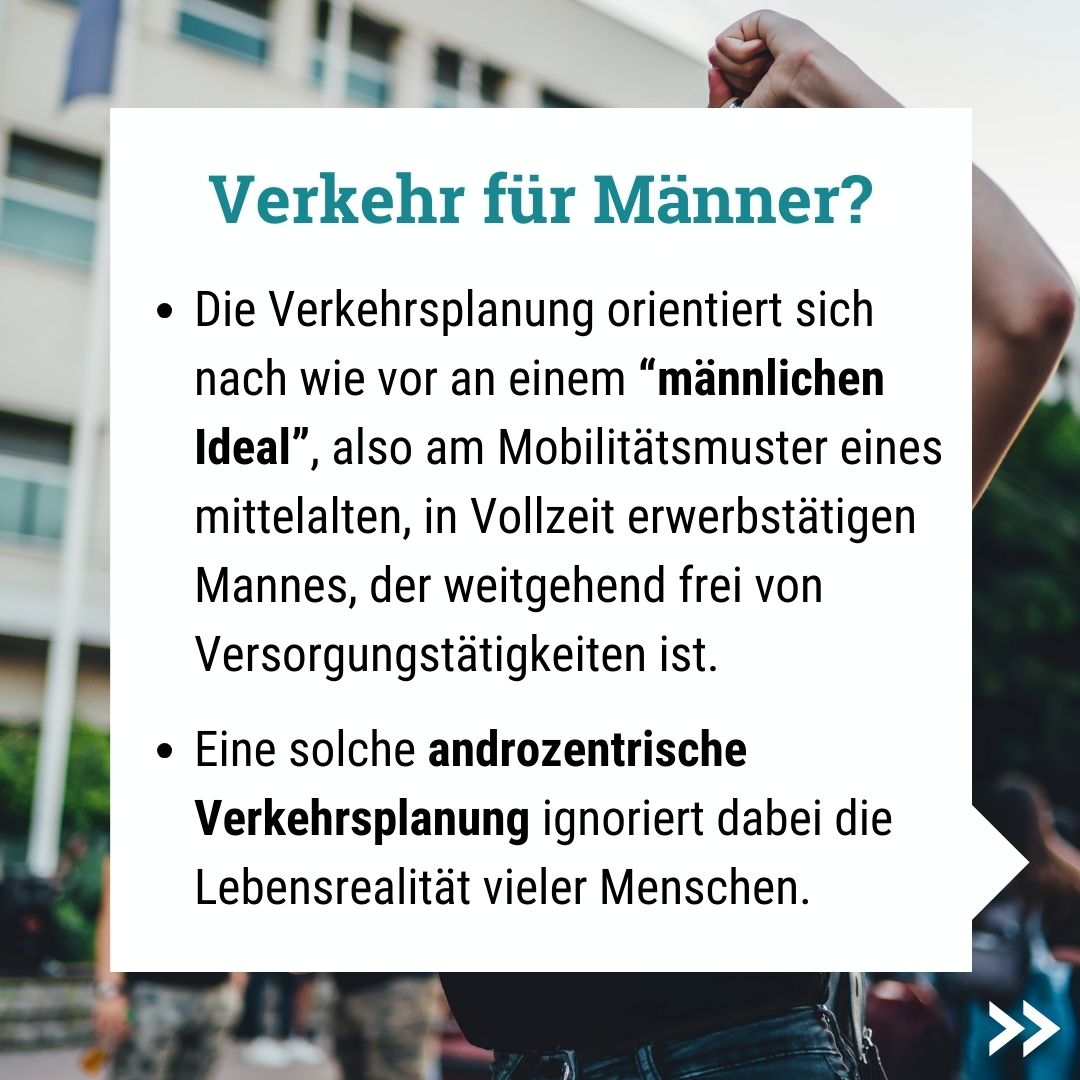 Die Verkehrsplanung orientiert sich nach wie vor an einem "männlichen Ideal", also am Mobilitätsmuster eines mittelalten, in Vollzeit erwerbstätigen Mannes, der weitgehend frei von Versorgungstätigkeiten ist.