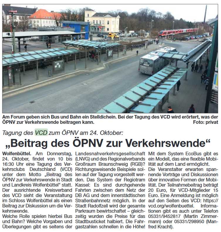 Der Artikel zur Ankündigung der ÖPNV-Tagung am 24. Oktober 2019 wurde am 13. Oktober 2019 im Wolfenbütteler Schaufenster veröffentlicht.