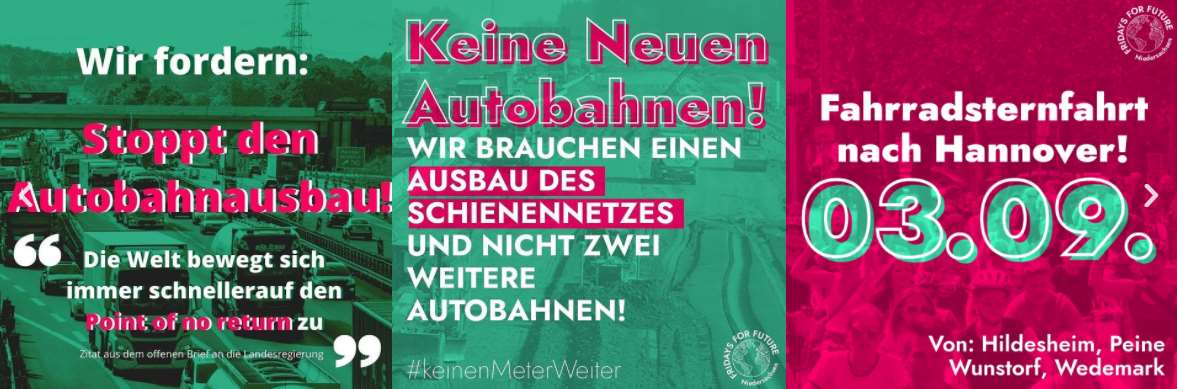 Fridays for Future Niedersachsen organisierte am 3.9.2021 eine Fahrradsternfahrt aus vier Städten nach Hannover mit einer Abschlusskundgebung auf dem Waterlooplatz. Eingefordert wurde die Verkehrswende und ein Autobahn-Baustopp. Der VCD Niedersachsen unterstützte die Aktion.