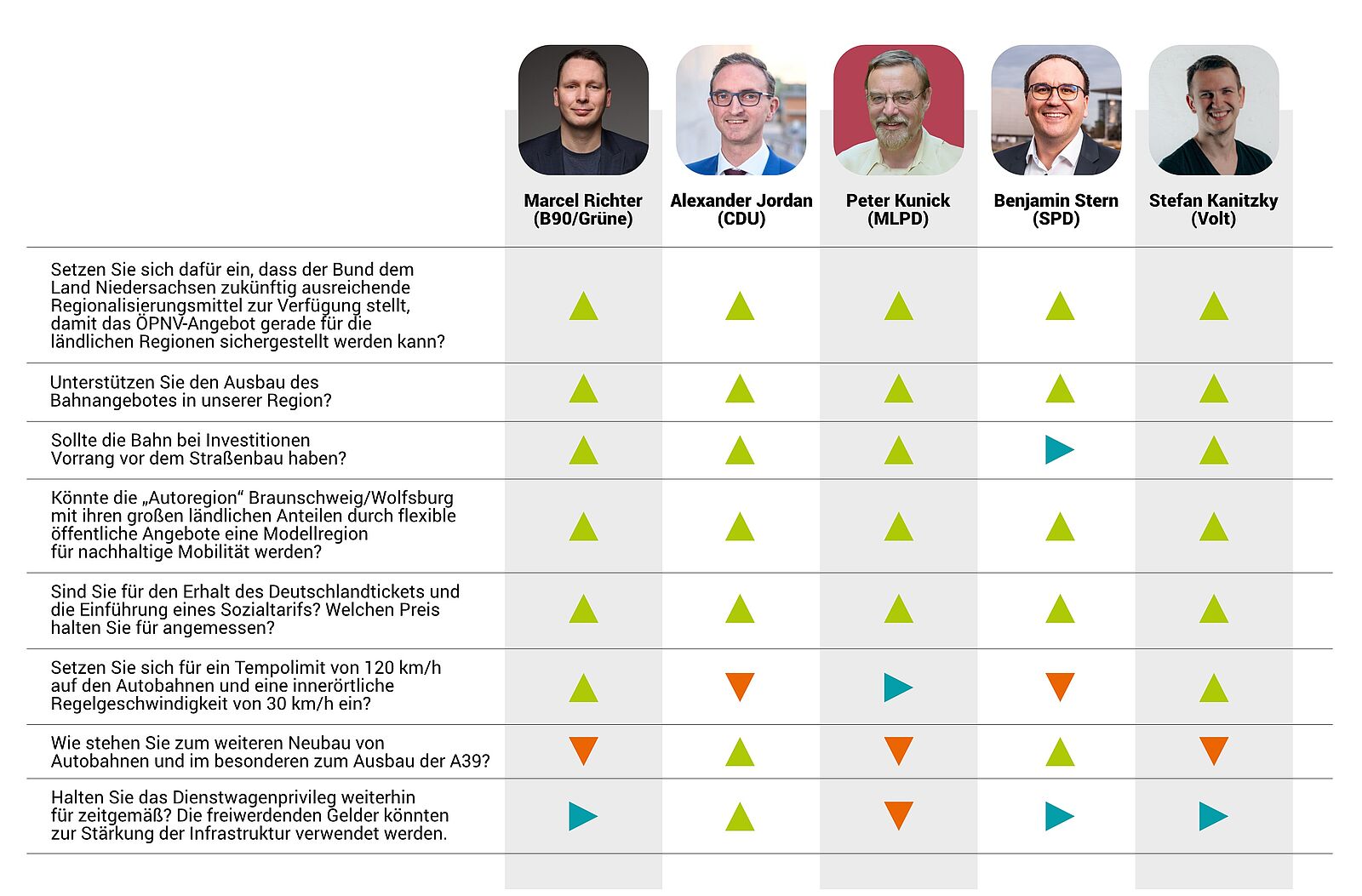 In der Übersicht stehen die grünen Dreiecke für eine Zustimmung, die türkisen Dreiecke für eine teilweise Übereinstimmung und die orangen Dreiecke für keine Zustimmung. Grüne Pfeile sind nicht gleichbedeutend mit einer Übereinstimmung mit den Zielen des VCD Wolfsburg. Gleiches gilt für die türkisen und orangen Pfeile. Die Reihenfolge der Kandidaten entspricht der alphabetischen Sortierung der Parteinamen.